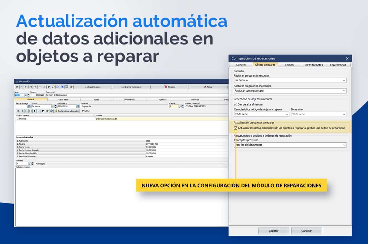 Ahora y con las nuevas mejoras, en la configuración del módulo de reparaciones, dentro de la pestaña «objeto a reparar» se encuentra la opción «actualizar los datos adicionales de los objetos a reparar al grabar una orden de reparación». Si la marcamos todas las modificaciones realizadas desde la orden de reparación se actualizarán automáticamente en el objeto a reparar.