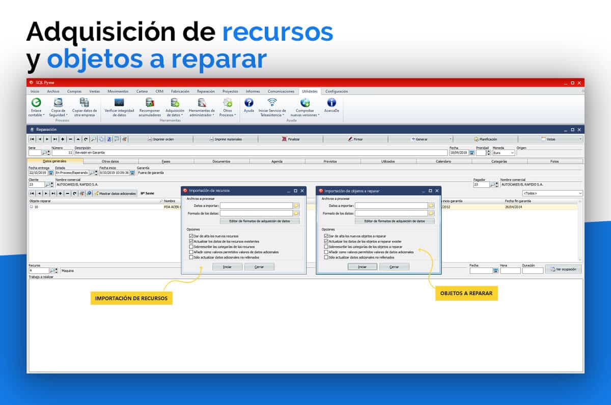 En ocasiones es necesario importar desde ficheros externos (Excel, Csv o Access, entre otros) gran cantidad de datos (tanto dar de alta elementos nuevos, como actualizar existentes), para lo que la aplicaciones proporciona varios procesos. Con esta actualización hemos añadido a los ya existentes, la posibilidad de realizar adquisición de datos de recursos y de objetos a reparar.