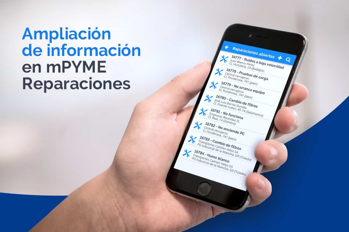 Una de sus opciones es mPYME Reparaciones, herramienta destinada a dar solución a departamentos técnicos desplazados en reparaciones. Entre sus múltiples posibilidades destacaríamos, gestión de ordenes de reparación, objetos a reparar, imputación, geolocalización, captura de firma digital y gestión documental.