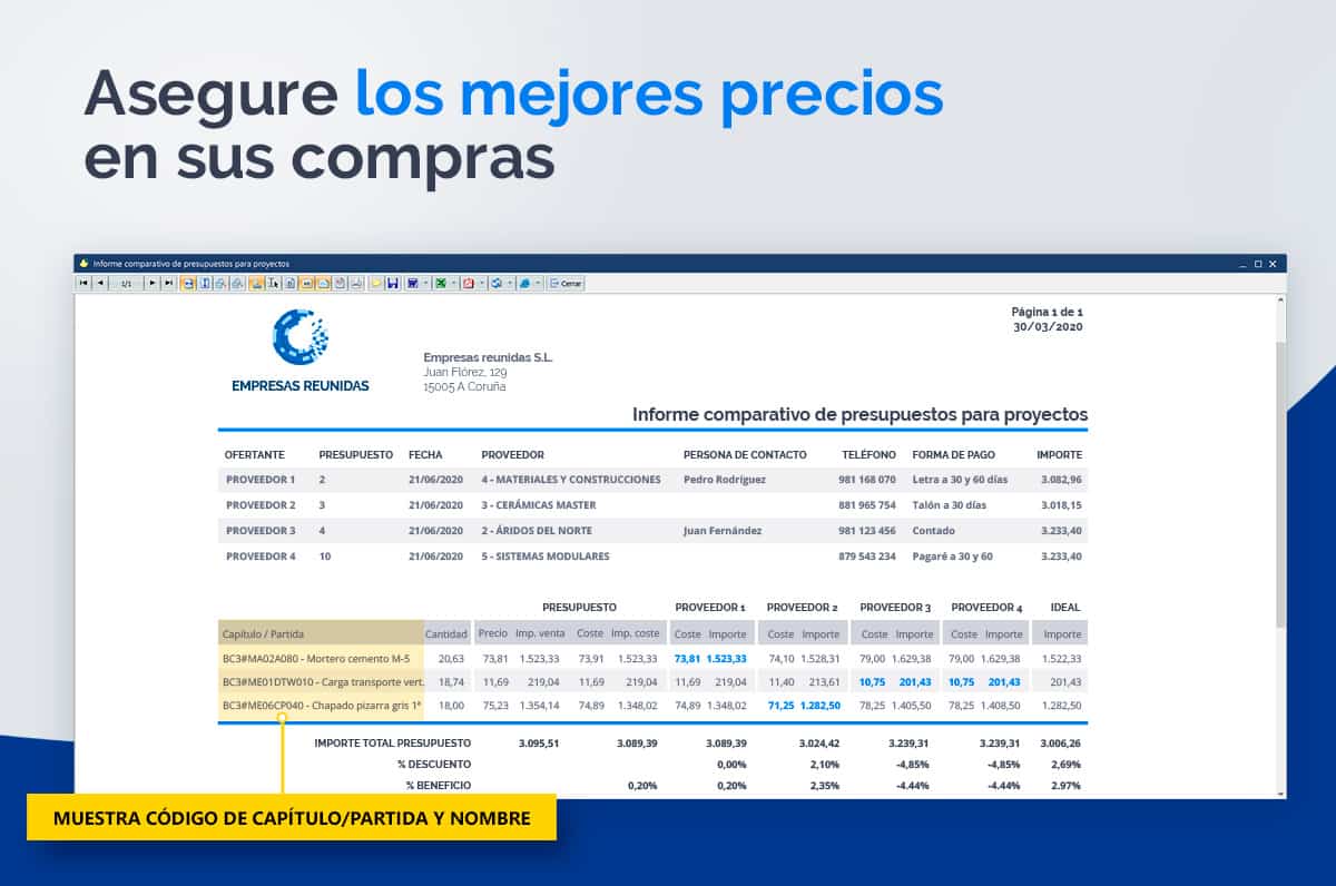 Para facilitar su uso con la ejecución de obras, se dispone ahora de una variante del informe, que en lugar de mostrar el artículo y su descripción, muestra el código de capítulo y partida y su nombre. Este informe se encuentra dentro del menú «Compras», desplegando la opción «Generar pedidos comparando presupuestos» y seleccionando «Informe comparativo de presupuestos para proyecto».