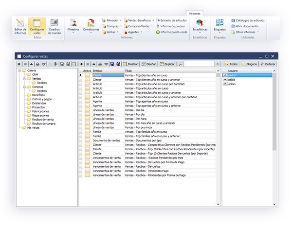 En el menú “Informes” disponemos de la opción “Configurar vistas” que nos dará acceso a la correspondiente pantalla de configuración: