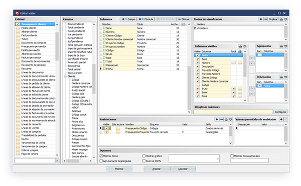 Podremos utilizar todos estos campos disponibles para seleccionar las columnas a mostrar en la tabla de datos de la vista, los valores que generarán las series para el gráfico de la vista, aplicar restricciones, agrupar, ordenar, etc.