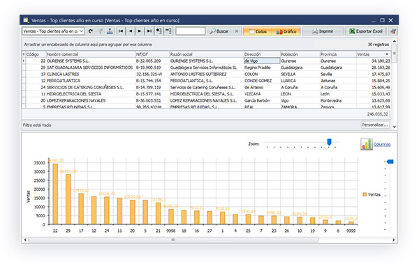 Disponemos también de la opción de imprimir la vista utilizando el botón “Imprimir” de la parte superior. La impresión respetará la disposición y agrupación de datos establecida en pantalla y podremos imprimir los datos, la gráfica o ambos.