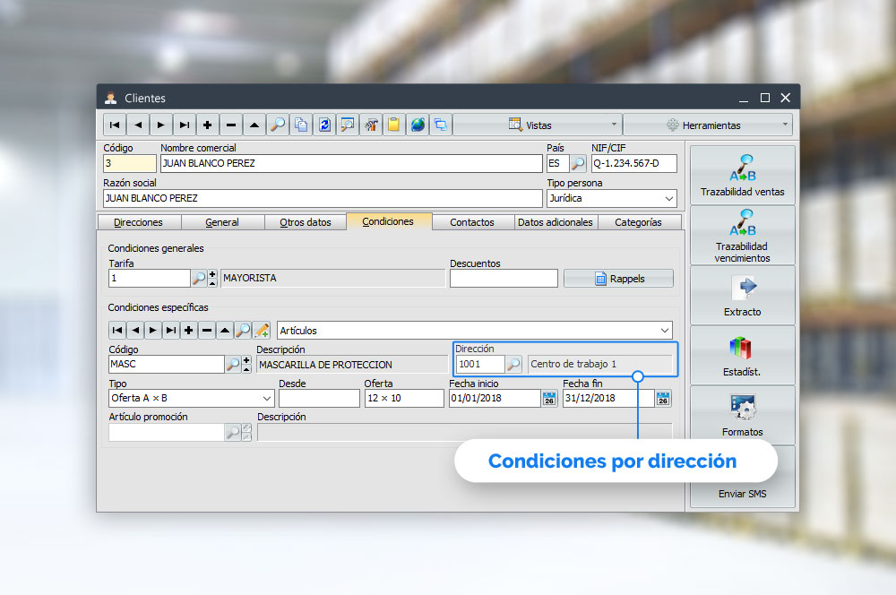 Estas condiciones pueden ser descuentos directos, descuentos incluidos, precios netos, cambios de tarifas, ofertas AxB e incluso A+B, y ahora no sólo genéricas para el cliente sino que podemos seleccionar en qué dirección de suministro (de las múltiples que puede tener) se deben aplicar de manera individual.