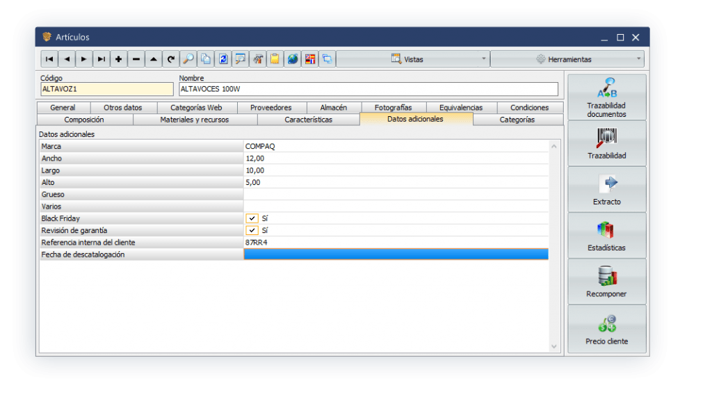Centrémonos por ejemplo en artículos. Desde esta entidad podemos dar de alta todos los datos adicionales que queramos conocer del producto, sin límite y con todo tipo de posibilidades.