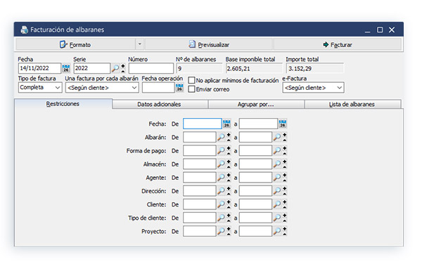 Para realizar la facturación deberá indicar la serie de las facturas a generar (si es que tienen) y la fecha de la factura. Además, podrá restringir por albarán, fecha, agente, cliente… permitiéndole así un gran abanico de posibilidades a la hora de seleccionar el tipo de facturación a realizar.