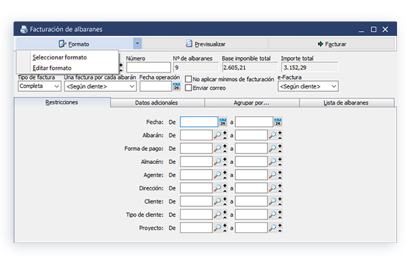 Este proceso genera las facturas a partir de los albaranes de clientes introducidos, agrupando los mismos que sean del mismo cliente y que tengan la misma forma de pago, de esta manera simplificamos la facturación y la carga de documentos y giros. Además, también existen otros condicionantes para que agrupe los albaranes de un mismo cliente, y son que tenga el mismo porcentaje de descuento en la cabecera, como el mismo descuento por pronto pago y que además tengan el mismo porcentaje de IVA para los portes y gastos varios.