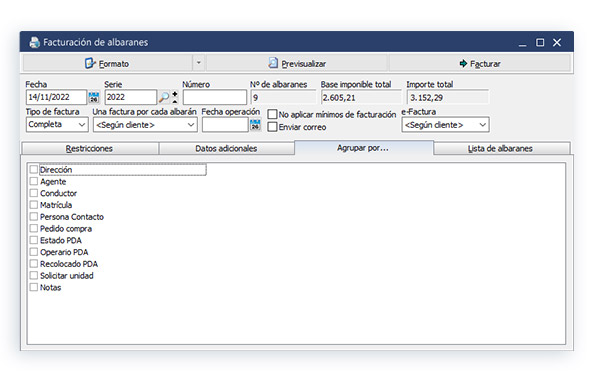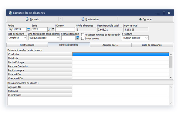 Agruparemos si queremos los albaranes que posean el mismo valor para un dato adicional (agrupar por dato adicional).