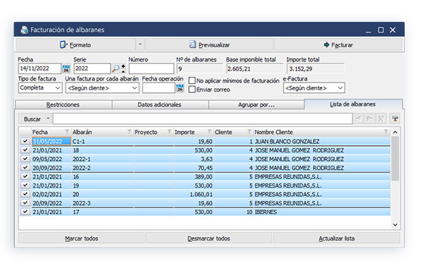 Existe otro apartado donde podemos MARCAR TODOS, DESMARCAR o ACTUALIZAR LISTA. En Marcar o Desmarcar, indicamos qué albaranes deseamos marcar, para facturar. La opción Actualizar Lista, se utiliza por si hemos variado el criterio de restricciones.