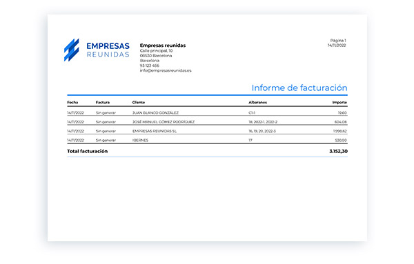 En FACTURAR, comenzaría el proceso de facturación. Una vez facturados los albaranes, podremos visualizar un informe de los albaranes que han pasado a factura, así como las facturas correspondientes a dichos albaranes.