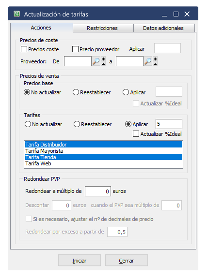 Dentro de la solapa de restricciones, podremos filtrar qué artículos o familias son los que queremos actualizar los precios o costes.