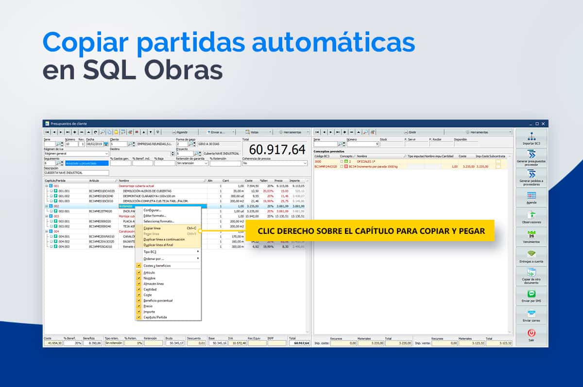 Una de las muchas funcionalidades de SQL Obras que ayuda notablemente en la confección de presupuestos u otros documentos, es la posibilidad de copiar los capítulos, con todo el desglose de subcapítulos y partidas, para duplicar en el mismo documento o utilizarse para otro.