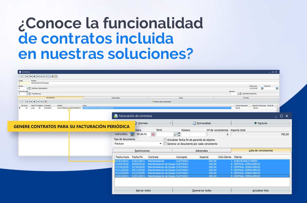 Esta funcionalidad nos permite dar de alta el contrato e indicar datos como descripción, cliente, fecha de inicio del contrato que vamos a facturar y la fecha de finalización de dicho contrato, forma de pago, almacén por defecto y en la parte de vencimientos podemos indicar el día de inicio de la facturación, la periodicidad mostrando cada cuántos meses se facturará (mensual, bimensual, trimestral, semestral, anual…) escogiendo también si va por mes adelantado o a mes vencido.
