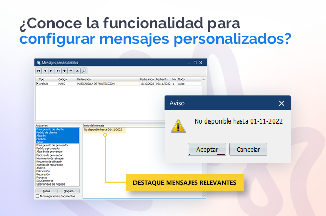 Dentro de los mensajes personalizados podremos indicarle una fecha de inicio o de fin del mensaje a mostrar, indicando además si el mensaje lo queremos en modo información, aviso, confirmación o error lo que hará que no nos deje continuar con ese cliente, proveedor o artículo, etc…