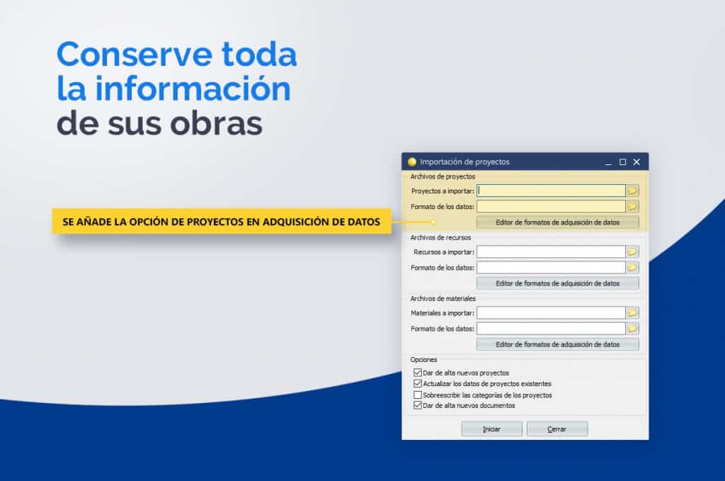 A partir de ficheros de texto, Excel o Access, entre otros, podremos importar en la aplicación los datos del proyecto, los materiales y recursos, tanto previstos como utilizados.