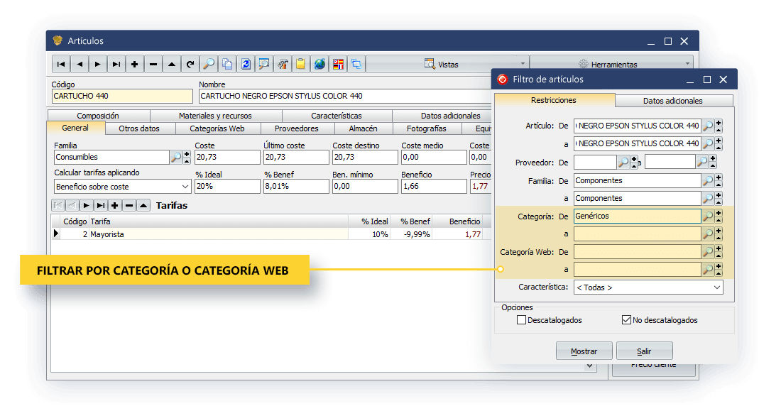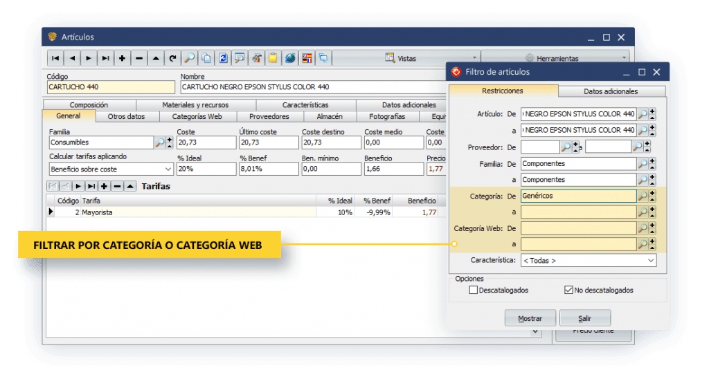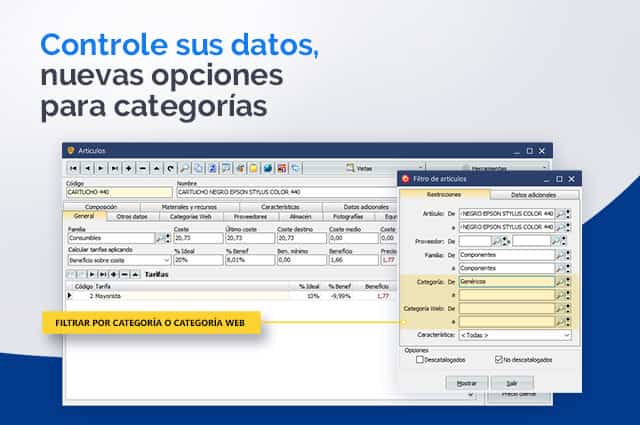 - Que en filtrado de la ventana de artículos, se puede hacer tanto por categoría como por categoría web, permitiendo así definir las búsquedas.