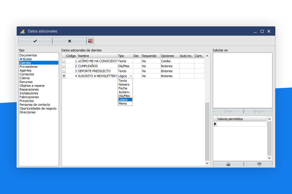 Estos datos adicionales, que luego se pueden utilizar a nivel de filtros de informe, se pueden imprimir en listados y documentos, se definen asociados a un tipo de dato, por ejemplo un número con sus decimales o un valor de fecha, a fin de facilitar la introducción de datos por el usuario.