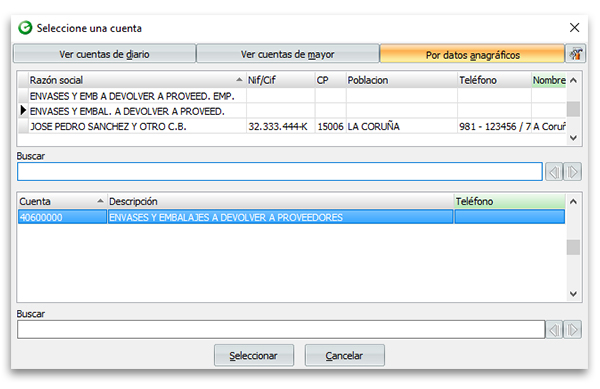 En la configuración de SQL Conta en la solapa de parámetros indicamos los subgrupos de cuentas que queríamos que tuviesen datos anagráficos, de manera que si nos situamos sobre una cuenta o damos de alta una cuenta de las que tenemos configurada como datos anagráficos nos aparecerá una última solapa, los DATOS ANAGRÁFICOS. En esta solapa será donde indiquemos todos aquellos datos a mayores necesarios para el IVA y la presentación de los modelos. Además, indicaremos la dirección, el tipo de IVA por el que se rigen, si llevan IRPF y su porcentaje, etc…