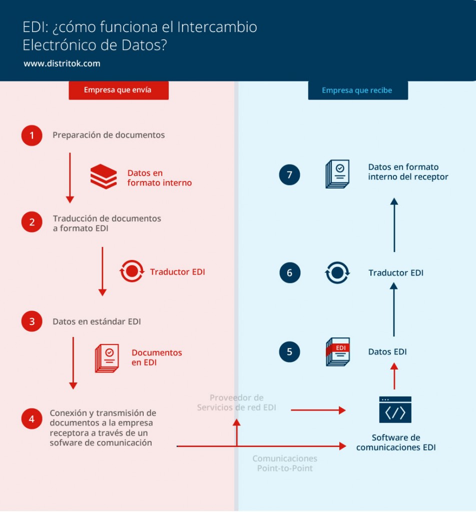 EDI, del inglés Electronic Data Interchange, facilita el intercambio de documentación (pedidos, albaranes, facturas, inventarios, catálogos de precios…) entre sistemas informáticos de aquellos que comparten una relación comercial. Mediante el uso de un lenguaje común permite que diferentes sistemas de información interactúen entre sí, automatizando su integración mediante programas de gestión o sistema ERP.