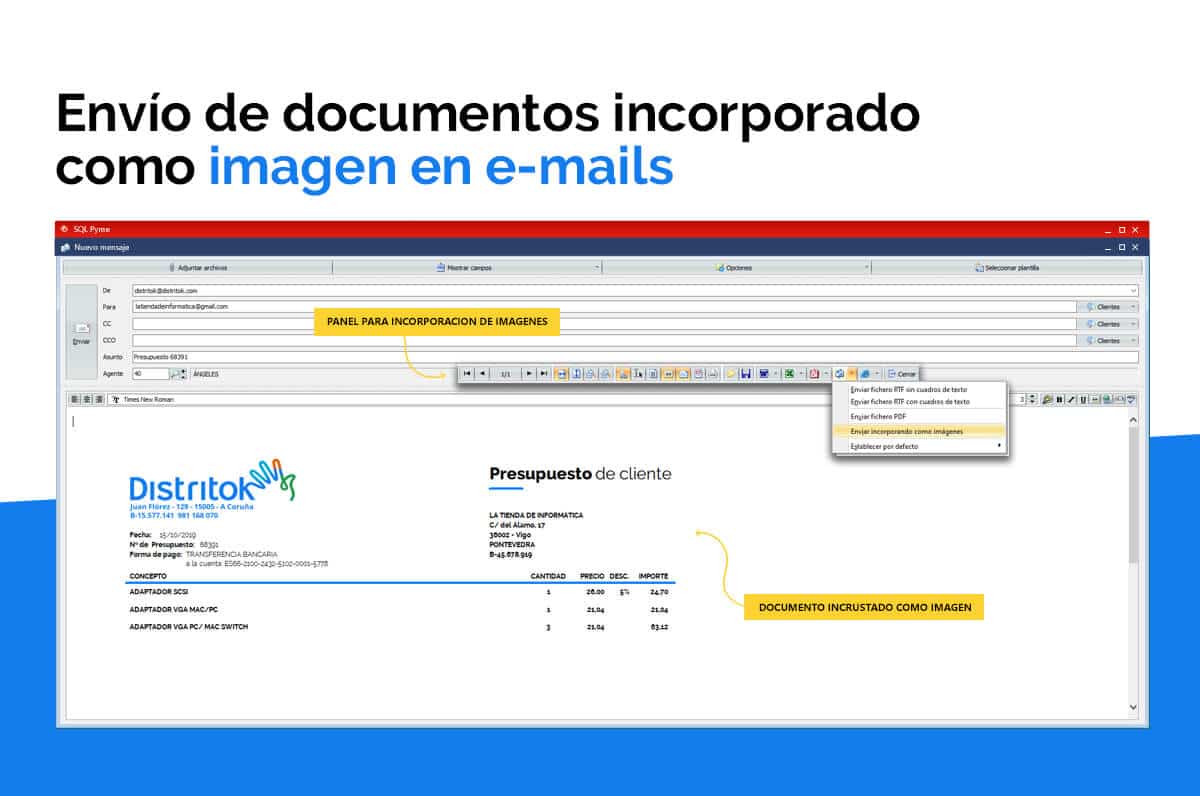 Una vez emitido un documento, un informe o una etiqueta, la aplicación nos muestra una vista previa, con el objetivo de poder imprimir los mismos o enviar por email en diferentes formatos adjuntos, como Pdf, Word, Excel. A partir de la última actualización, se incorpora una nueva funcionalidad en el envío de correos, que incluye el documento incrustado como imagen en el cuerpo del mensaje.