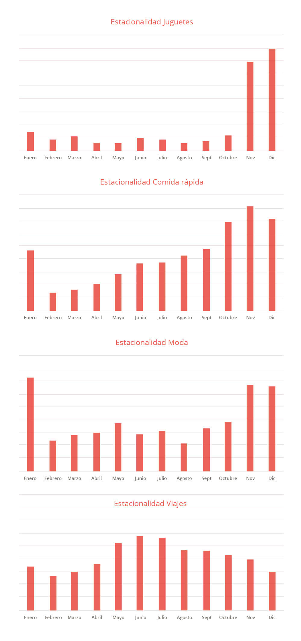 Como en todos los tipos de mercados la estacionalidad también puede ser una herramienta al servicio de la mejora de ventas en los más diversos sectores. Últimamente las compras navideñas tienden a adelantarse y la ventas de juguetes se realizan en el margen de los 2 a 3 últimos meses del año. Asimismo el 62% de las compras se ejecutan durante el fin de semana. El año experimenta una subida gradual que se dispara cuanto más nos acercamos a diciembre.