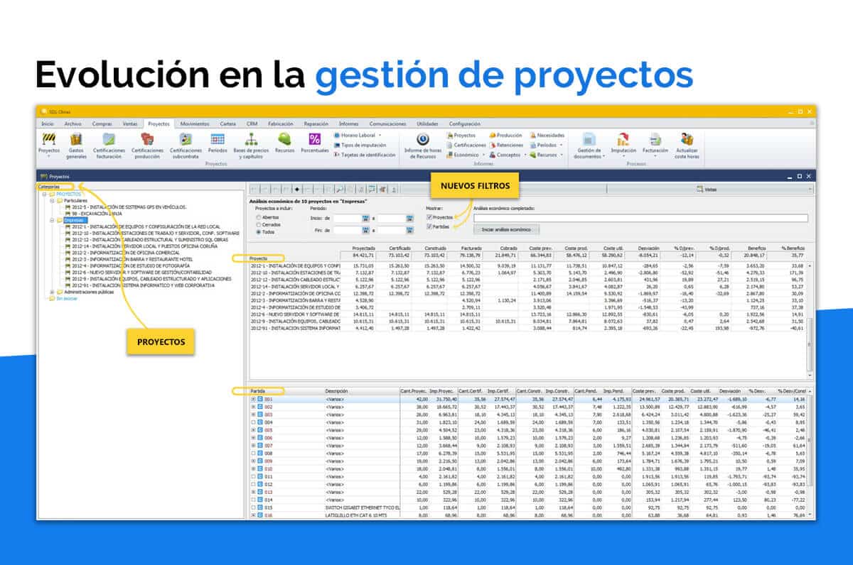 Una vez categorizados, podemos ver de forma conjunta el análisis económico de todos los proyectos que se encuentren en cada una de estas categorías. Además, se pueden ver también los importes de cada uno de los proyectos, con los márgenes y desviaciones.