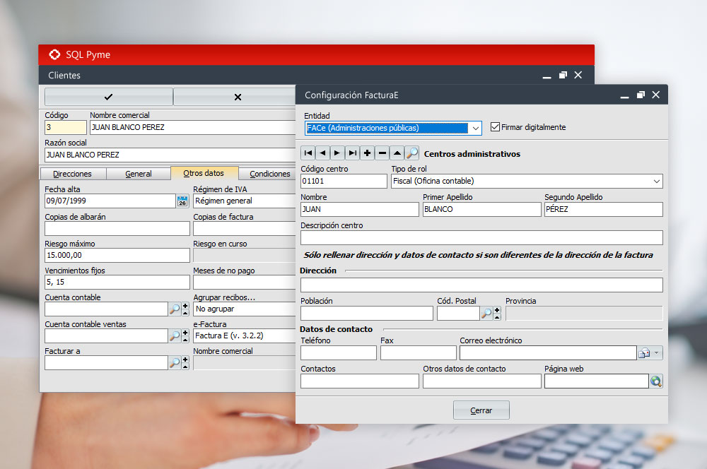 Simplemente configure en la ficha de su cliente los datos necesarios para la presentación a través del portal FACe y sólo con tener instalado en el ordenador su certificado digital podrá, directamente desde el programa de gestión, emitir la Factura Electrónica con total seguridad y garantías.