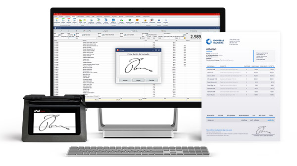 Capture la firma a través de una tableta digitalizadora conectada al ordenador e imprima el albarán en pantalla, para enviarlo directamente por correo electrónico y, por supuesto, conserve la firma a salvo dentro del sistema, asegurando la recepción, además de la velocidad y la aceleración de la firma.