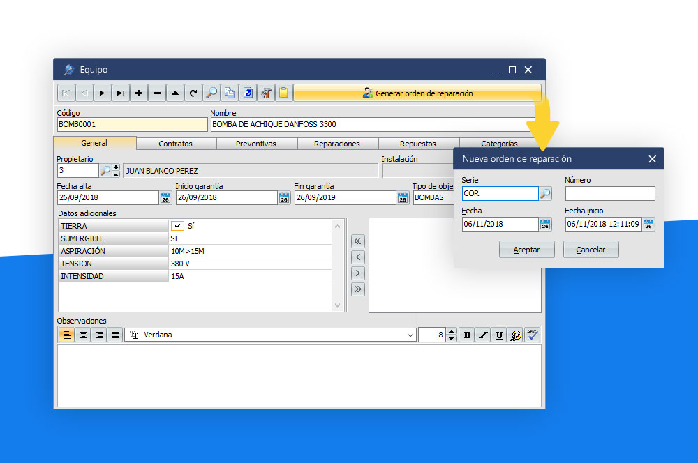 Hoy vamos a presentaros una de esas mejoras que responden a las peticiones de nuestros clientes. Hemos añadido la posibilidad de generar órdenes de reparación directamente desde el propio objeto a reparar. Simplemente pulsamos en el botón y ya se crea la orden heredando todos los datos del equipo seleccionado.