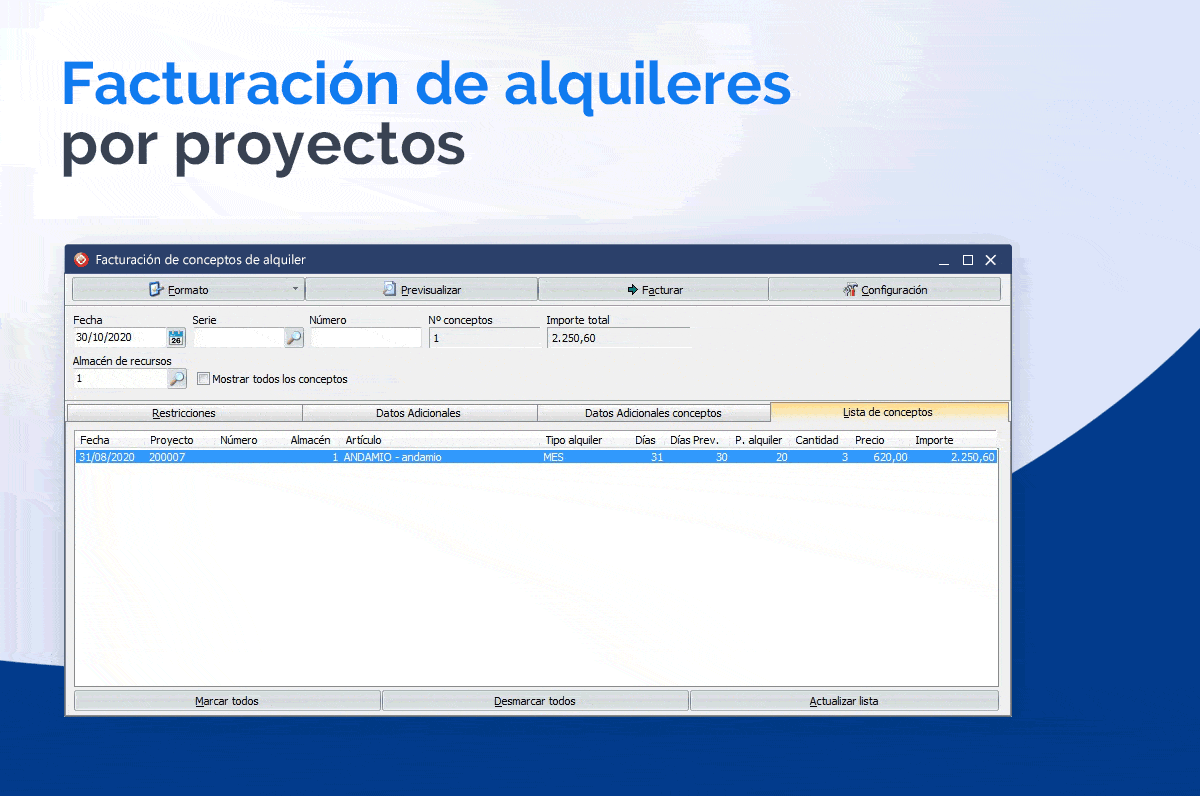 El proceso de facturación de alquileres consiste en seleccionar los albaranes de alquiler y devolución que se encuentren pendientes de facturar y emitir las facturas correspondientes al servicio de alquiler de los productos contenidos en dichos albaranes.