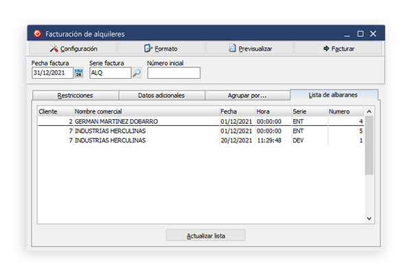 El proceso de facturación de alquileres consiste en seleccionar los albaranes de alquiler y devolución que se encuentren pendientes de facturar, pertenecientes a las series indicadas en la configuración, y emitir las facturas correspondientes al servicio de alquiler de los productos contenidos en dichos albaranes.