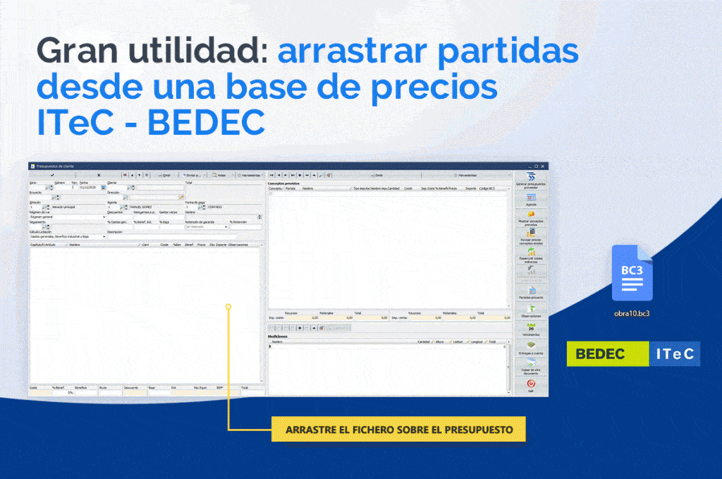 Desde esta nueva funcionalidad podemos descargar e incorporar partidas, simplemente disponiendo del fichero y arrastrando el mismo sobre el presupuesto de nuestra aplicación, es decir pinchamos, por ejemplo, un BC3 que tengamos en el escritorio, lo arrastramos a la aplicación dentro de la opción Ventas / Presupuestos y, al arrastrarla, se incorporará la partida con su descripción así como el descompuesto y las observaciones. Incluso podríamos desde la propia web de ITeC, seleccionar una partida y arrastrarla al presupuesto generado dentro de la aplicación, teniendo como objetivo el mismo fin, la incorporación de la partida con su descripción así como el descompuesto y las observaciones.