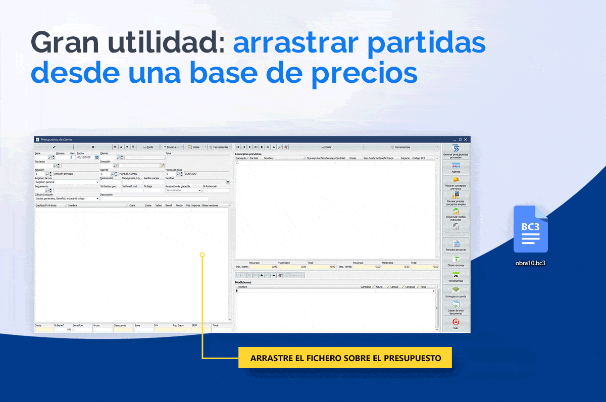 A todo esto se le suma ahora la posibilidad de poder descargar e incorporar partidas, simplemente disponiendo del fichero y arrastrando el mismo sobre el presupuesto de nuestra aplicación, es decir pinchamos por ejemplo un BC3 que tengamos en el escritorio, lo arrastramos a la aplicación dentro de la opción Ventas / Presupuestos y, al arrastrarla, se incorporará la partida con su descripción así como el descompuesto y las observaciones.