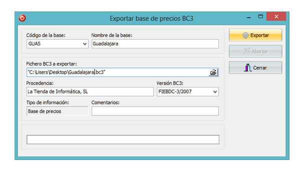 El proceso de importación de Bases de Precios consta de dos fases. En primer lugar debemos seleccionar el fichero BC3 a importar y pulsar el botón Cargar fichero. Si es posible la aplicación intentará extraer de los datos contenidos en el fichero un código y un nombre para la Base de Precios. Si dicha información no está disponible quedará en blanco. En cualquier caso nosotros podremos modificar dichos campos para definir el código y el nombre deseado.