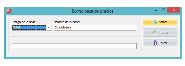 Para eliminar una Base de Precios, la seleccionaremos en la casilla desplegable de entre las existentes en nuestra base de datos y pulsaremos el botón Borrar. Este proceso eliminará las siguientes entidades: Los Capítulos y Subcapítulos correspondiente a la Base de Precios. Las Familias y Subfamilias correspondientes a la Base de Precios. Los Recursos pertenecientes a la Base de Precios según su Codigo BC3. Los Artículos que estén asignados a alguno de los Capítulos de la Base de Precios.