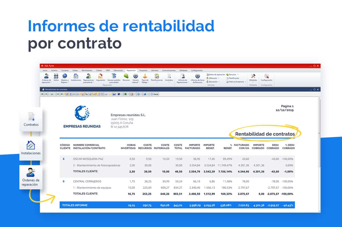 Hemos añadido a estos informes, el informe de rentabilidad por contratos e instalaciones. Este informe permite filtrar por cliente, instalación, contrato, tipo de contrato y periodo, y tendrá en cuenta las reparaciones realizadas a cada cliente, y la imputación de materiales y recursos en cada una de ellas, para comparar el importe del contrato, con estas imputaciones, e indicarnos el beneficio o desviación que tiene cada cliente.