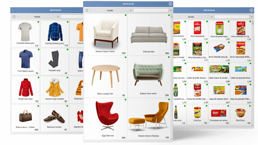 Adapte la presentación de los artículos para su mayor comodidad y/o el tamaño de su dispositivo. Dicha presentación podrá ser con fotos pequeñas, medianas o grandes y en formato catálogo donde podrá mostrar las fotos del producto en gran formato.