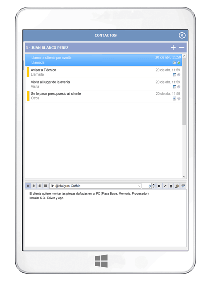 Registre y consulte las incidencias y seguimientos de las órdenes de reparación. Genere alarmas de citas previstas con la posibilidad de avisar con antelación a la hora establecida.