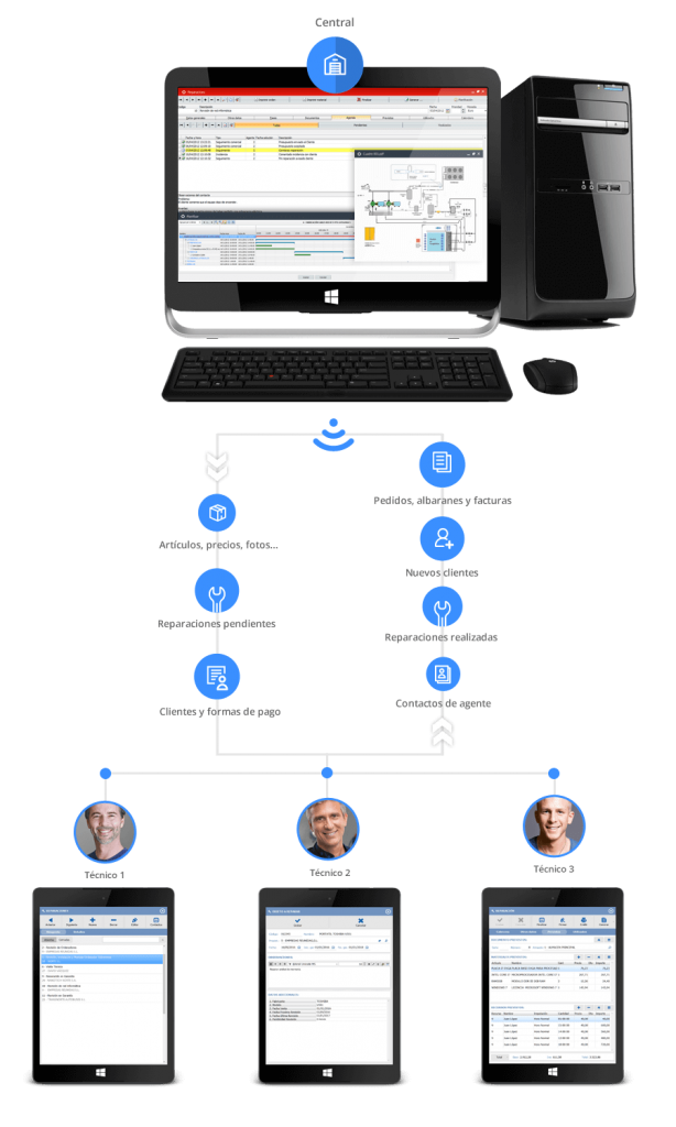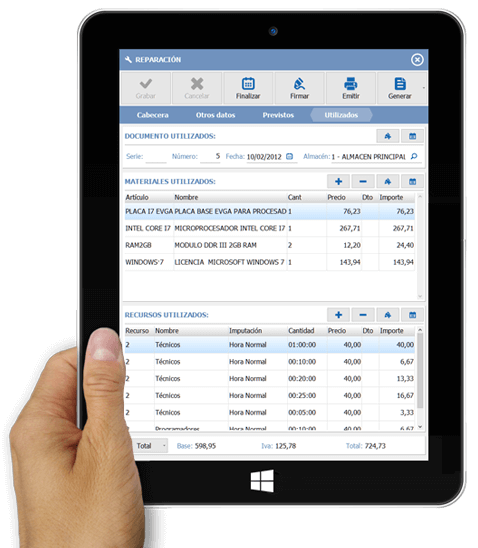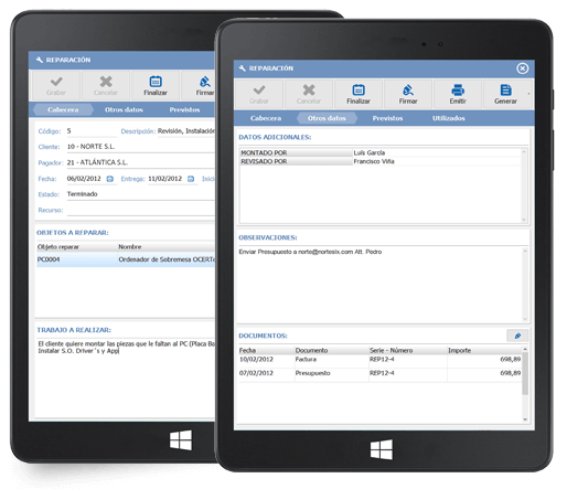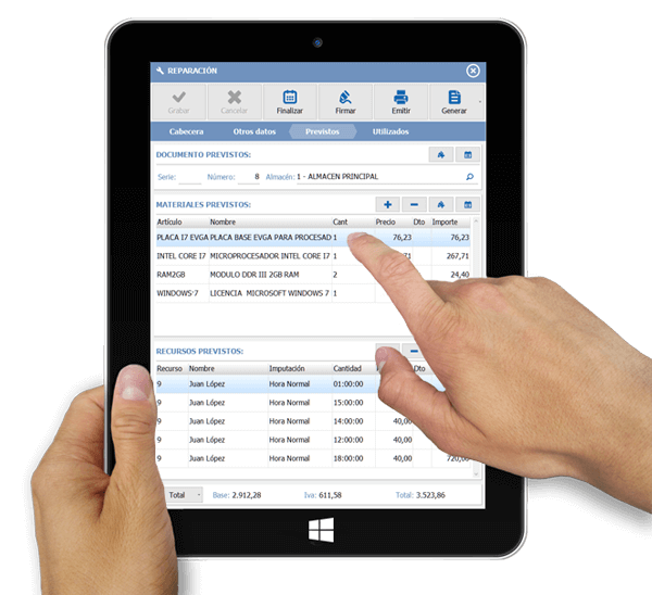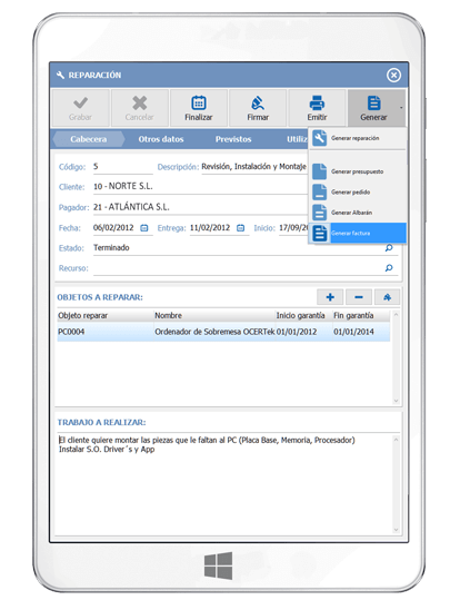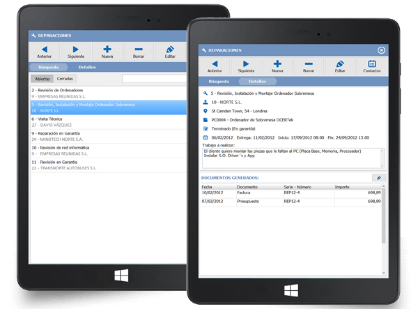 Nuestro software de reparaciones para Tablet, le permite realizar y gestionar órdenes de reparación cómodamente, desde una sola opción le permitirá tener una visión global de todo el proceso, gestionar reparaciones pendientes, administrar recursos y materiales, crear presupuestos, gestionar garantías, realizar reparaciones preventivas, facturar y cobrar…