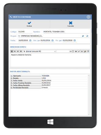 Cree y gestione objetos a reparar registrándolos para su posterior seguimiento, pudiendo almacenar el número de serie, el período de garantía, el cliente al que pertenece y cualquier otro campo adicional que precise.