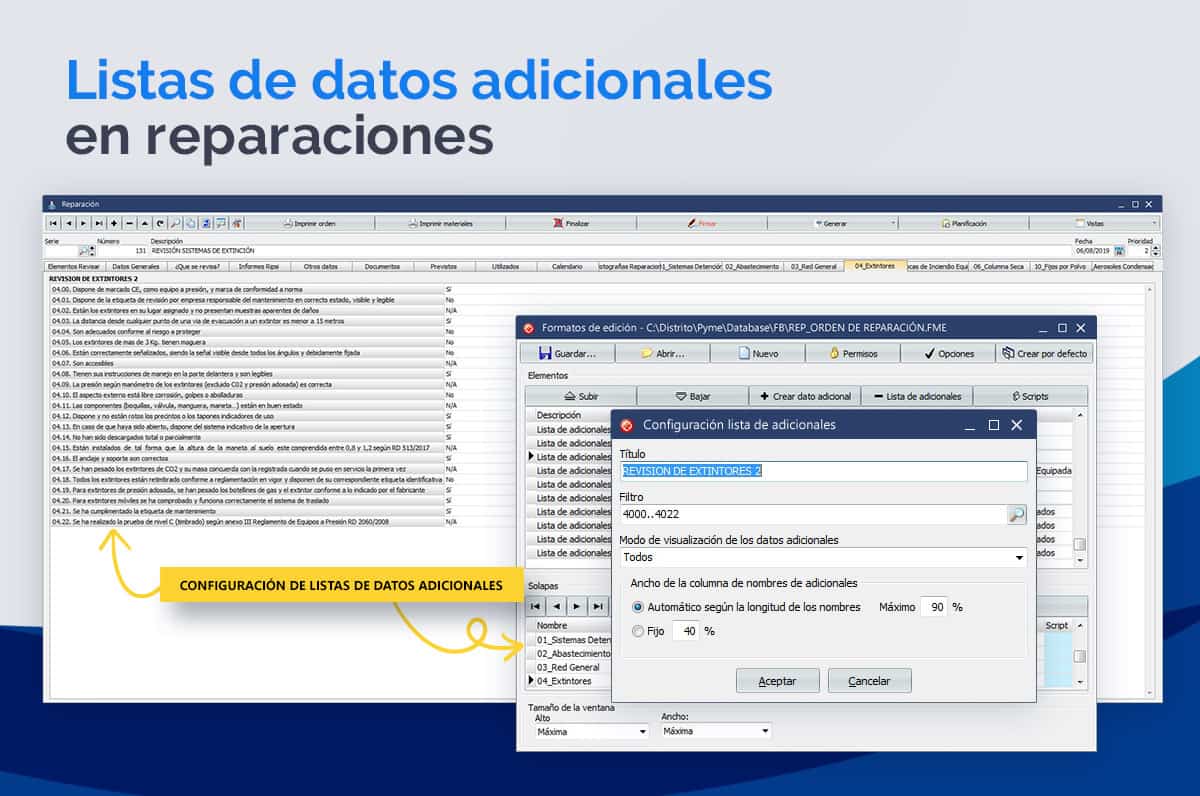 Las listas se crean desde el formato de edición de reparaciones con el botón «Lista de adicionales», informando un título identificativo y un filtro con los códigos de datos adicionales que incluirá. Además, se puede personalizar el modo de visualización y el ancho. Una vez definido, la nueva lista creada aparecerá en el editor del formato de edición como un campo más.