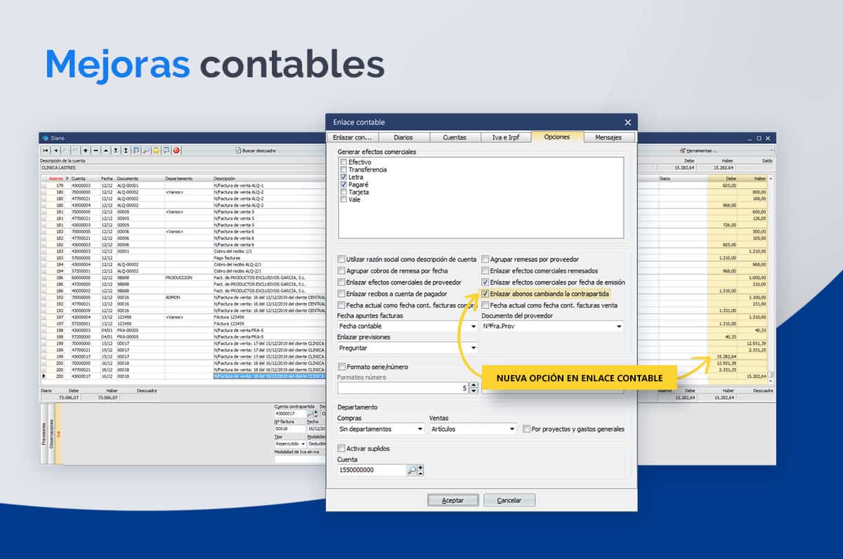 En la configuración del enlace contable, en la pestaña «Opciones», dispondremos a partir de ahora la nueva opción «Enlazar abonos cambiando la contrapartida». Con esta casilla activada, en los asientos de abonos aparecerán los importes en positivo e invertidos el debe y el haber.