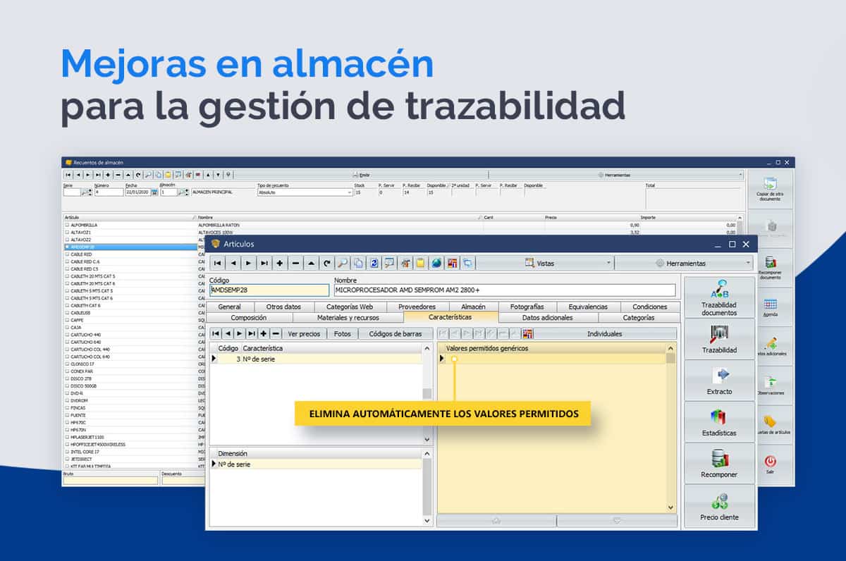 Existen características como el número de serie, que se suelen crear con la opción «añadir automático». De esta forma los valores de la característica que se introducen en las entradas, se dan de alta como valores permitidos automáticamente. En estos casos es deseable que cuando se ponen estos artículos a 0 también se eliminen sus valores permitidos.