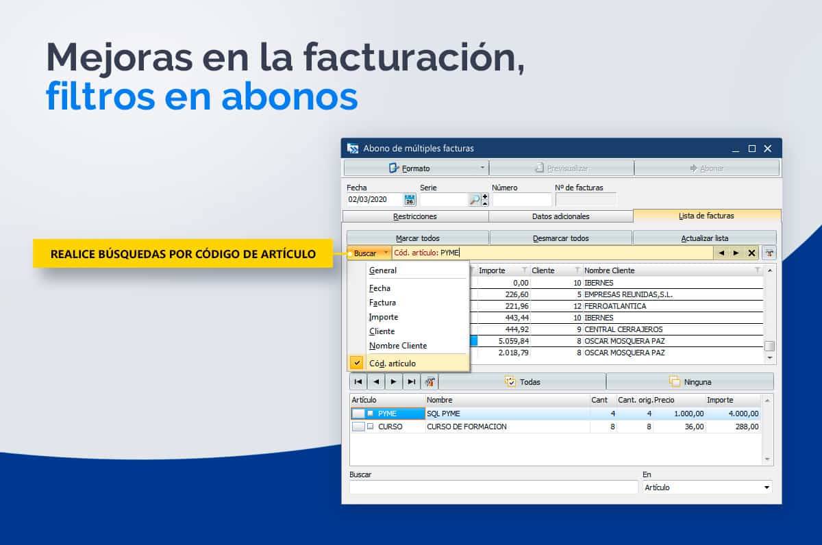 Esta opción está disponible dentro del menú de «Facturas» en «Ventas», y permite seleccionar varias facturas y abonarlas masivamente. Otra de sus posibilidades, es que ofrece la opción de marcar sólo ciertas líneas para abonar, sin necesidad de abonar el documento por completo.