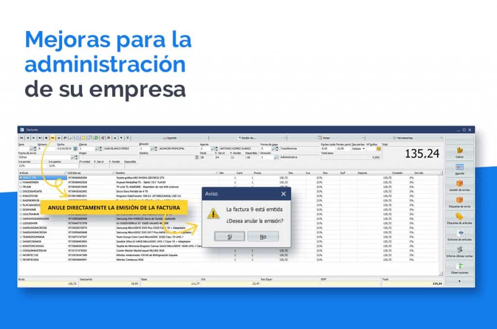 A la opción de anular emisión del menú de Ventas->Documentos->Anular emisión, se añade la posibilidad de hacerlo directamente desde el nuevo botón “eliminar documento”. Cuando se intente borrar una factura o ticket ya emitidos, en la cabecera del documento, en la opción eliminar, la aplicación pedirá confirmación para anular la emisión, siempre y cuando el usuario tenga permiso para hacerlo, y teniendo en cuenta los mismos parámetros, es decir, anulando primero los vencimientos, para evitar que no haya descuadres.