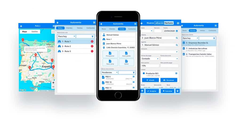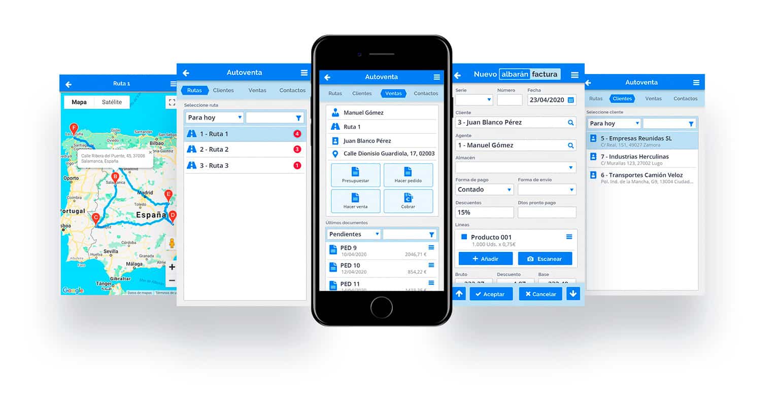 Cree rutas, asigne clientes, y defina prepedidos con los productos habituales… Trabaje con un catálogo totalmente visual y táctil, desde un móvil o tablet. Genere pedidos (o albaranes, o facturas) contemplando las condiciones comerciales de cada cliente de tal forma que se erradiquen los errores. Almacene la firma del cliente una vez finalizada la operación y realice los cobros… y todo ello actualizándose en su ordenador central en tiempo real.