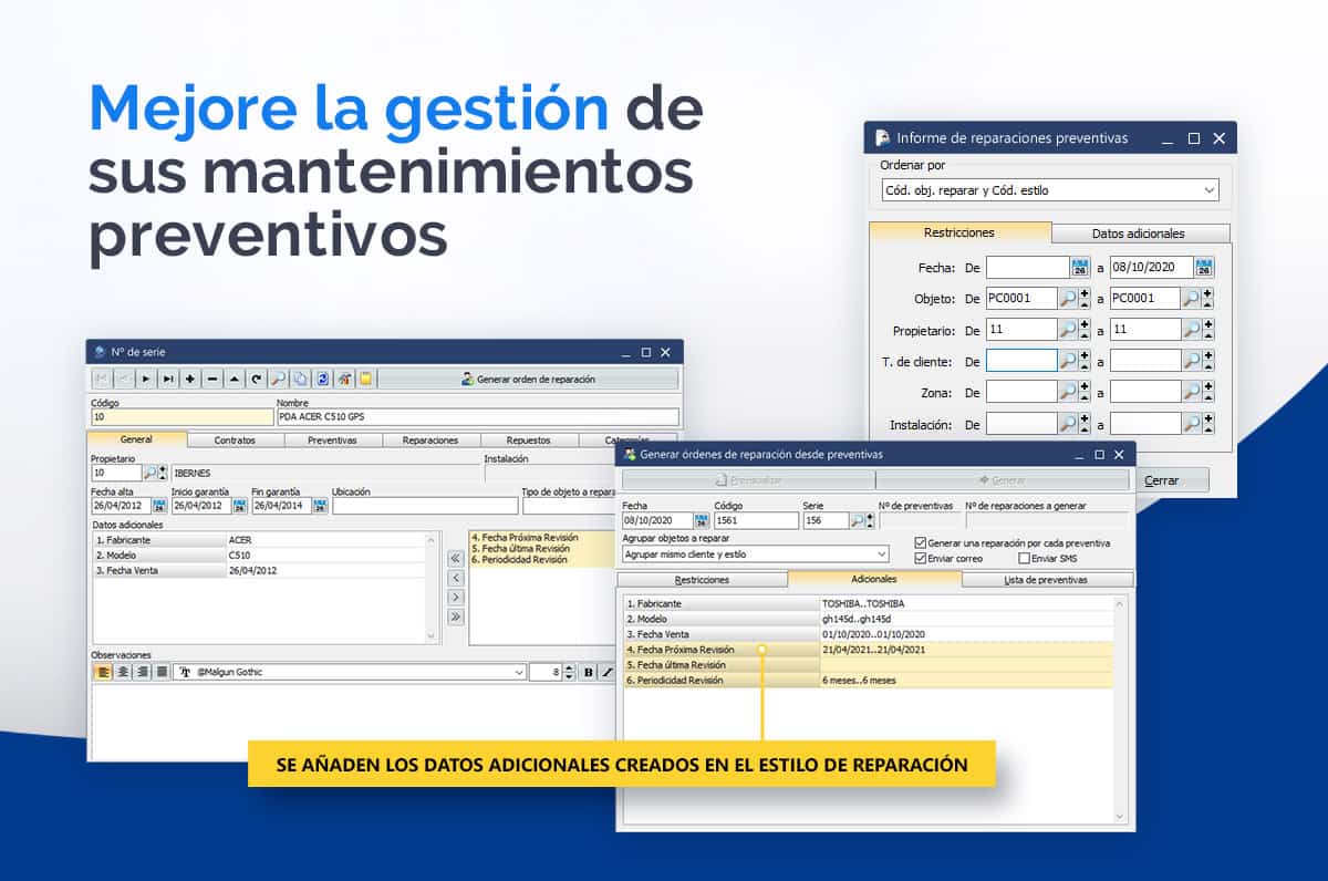 Los mantenimientos preventivos permiten planificar la gestión de mantenimientos de los equipos y de los elementos en garantía o sujetos a un contrato de mantenimiento. Nuestro avanzado sistema de gestión de reparaciones permite realizar un control de revisiones de cada pieza y en función de parámetros como cliente, elemento, fecha, instalación, conocer un informe de las preventivas a realizar, pudiendo enviar a orden de reparación las deseadas.