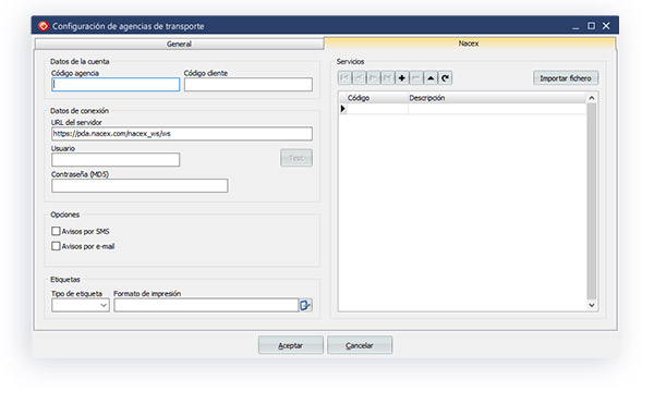 Hemos desarrollado una integración a través de web services, en la que se soportará la preparación de envío, anulaciones de envío y la generación de etiquetas de NACEX.