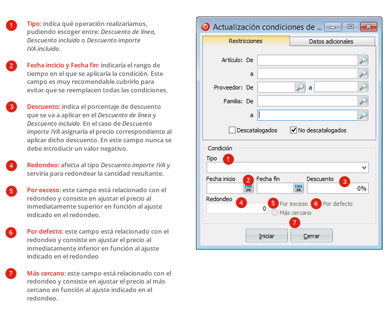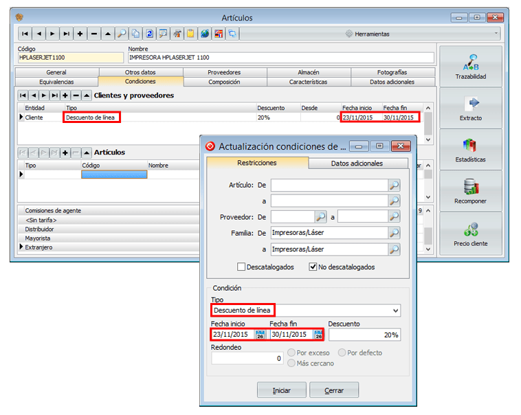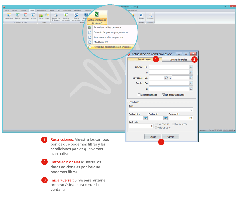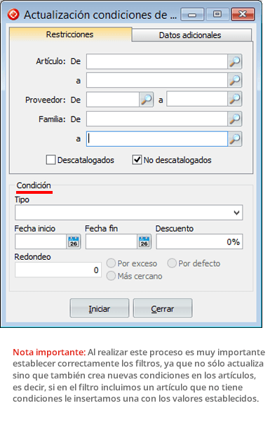 En Restricciones y Datos adicionales podemos establecer filtros para determinar sobre qué artículos vamos a realizar el proceso. En el cuadro de Condición se indicarían los valores de la condición que vamos a aplicar sobre los artículos filtrados.