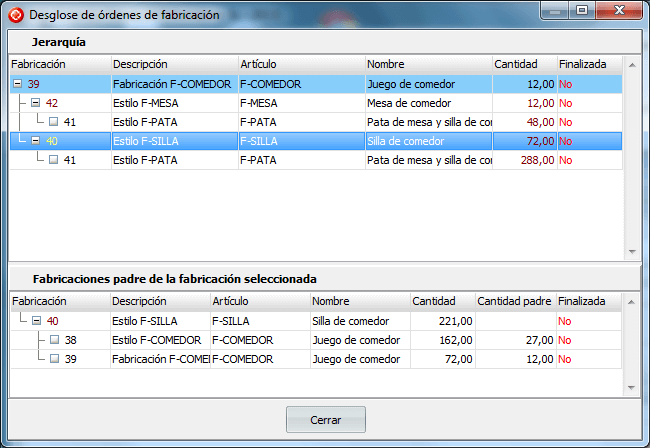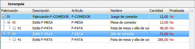 La rejilla de Jerarquía nos muestra la jerarquía de fabricación asociada la orden de fabricación mostrada en la primera fila y marcada con un azul claro.